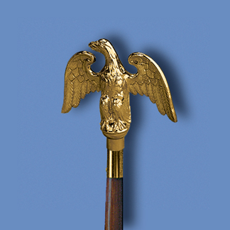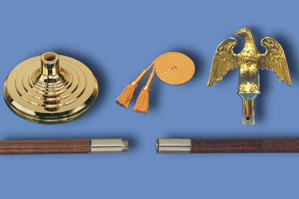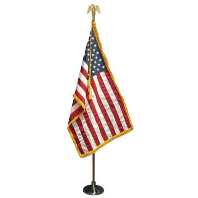 Complete Freedom Flag Set includes a Endura-Nylon U.S. Flag with embroidered stars, sewn stripes, pole hem and gold fringe, a shiny gold plated ABS Styrene 7″ perched eagle, a gold cord & tassel, a 2-piece 8′ x 1 1/4″ Dia. Oak pole with brass screw joint and a 12″ Dia. shiny gold plated plastic Regent floor stand. $349